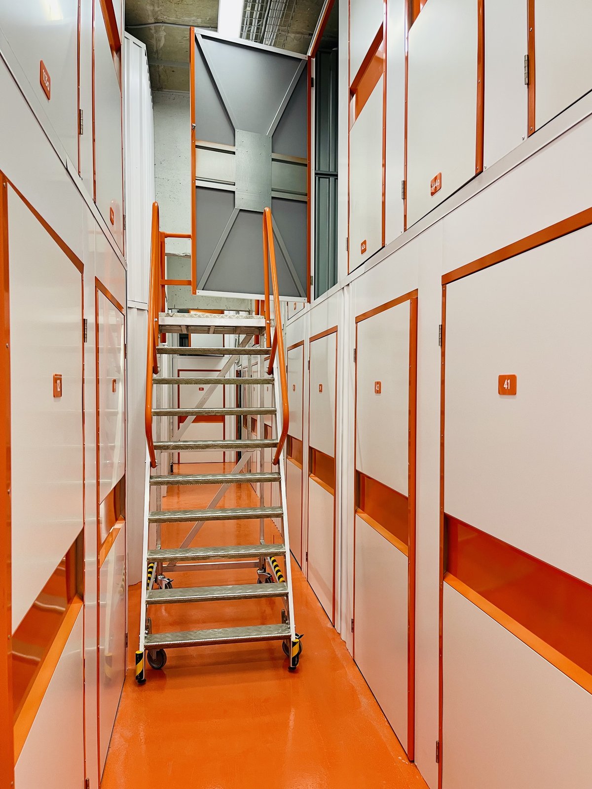 Кладовки 2-го яруса высоко: чтобы попасть в них, используйте лестницу-платформу. Такие антресольные боксы бюджетнее, но в них сложнее размещать тяжелые предметы.