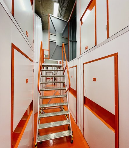 Кладовки 2-го яруса высоко: чтобы попасть в них, используйте лестницу-платформу. Такие антресольные боксы бюджетнее, но в них сложнее размещать тяжелые предметы.
