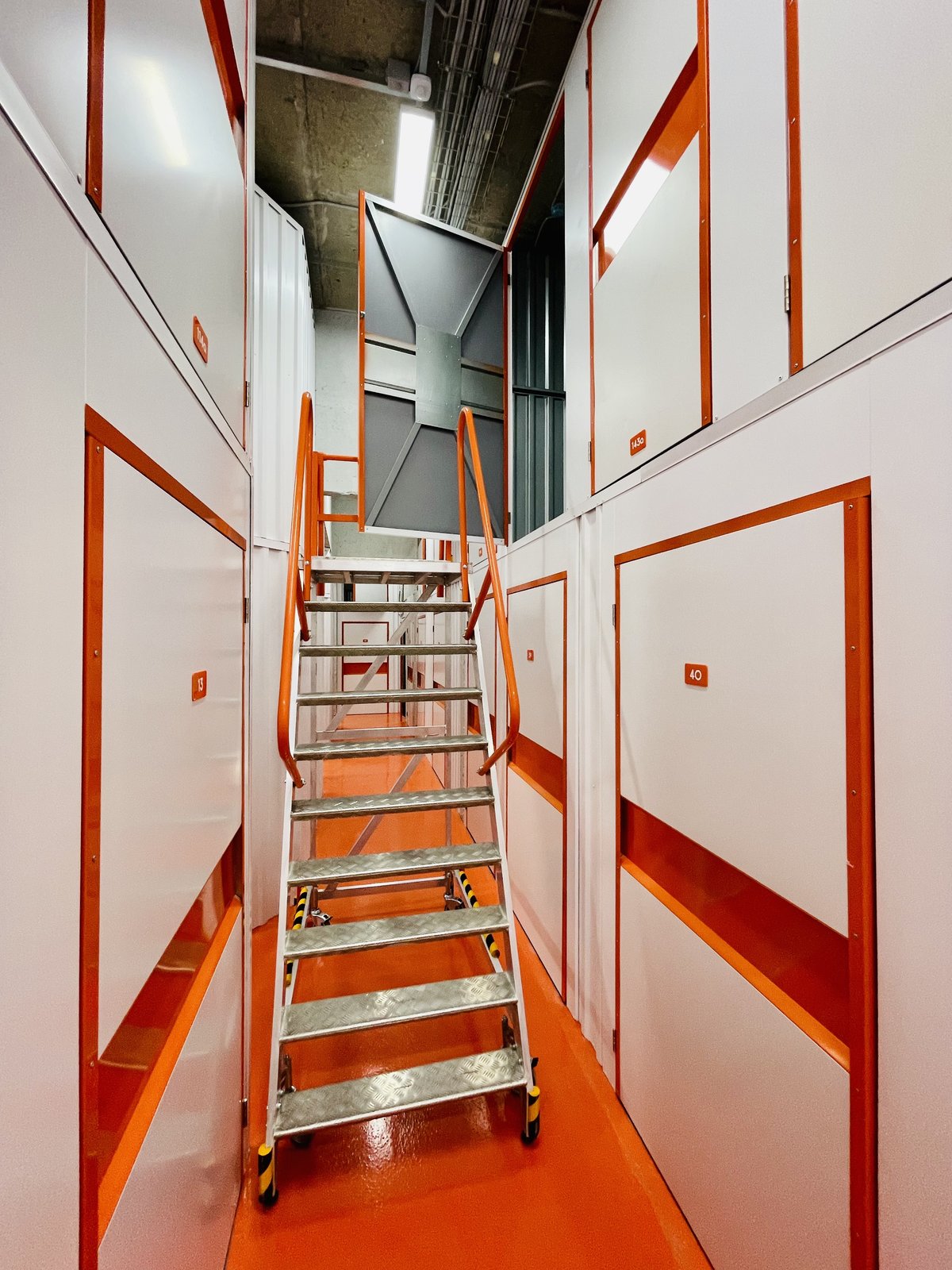 Кладовки 2-го яруса высоко: чтобы попасть в них, используйте лестницу-платформу. Такие антресольные боксы бюджетнее, но в них сложнее размещать тяжелые предметы.