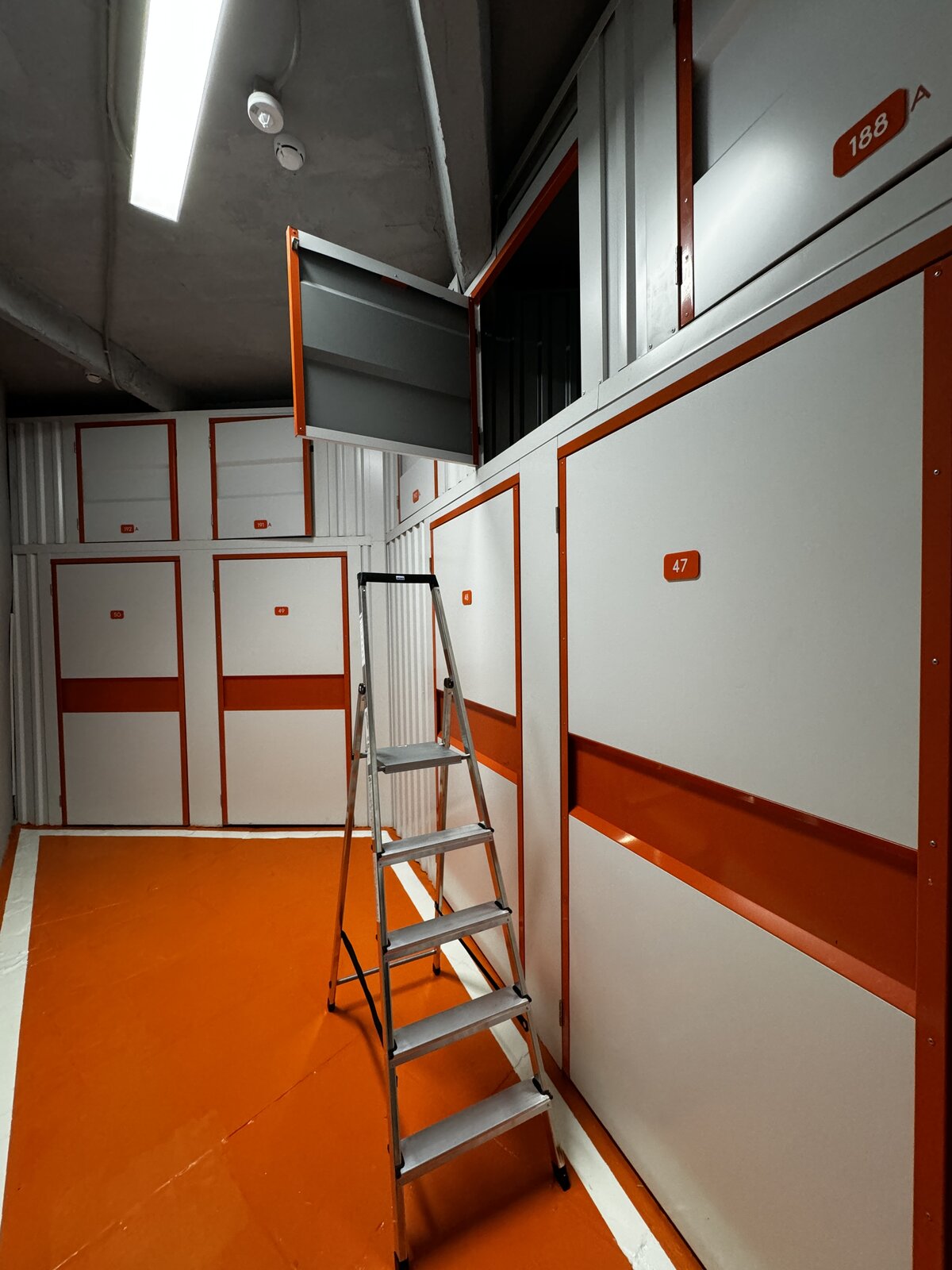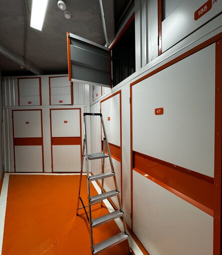 Кладовки 2-го яруса высоко: чтобы попасть в них, используйте лестницу-платформу. Такие антресольные боксы бюджетнее, но в них сложнее размещать тяжелые предметы.