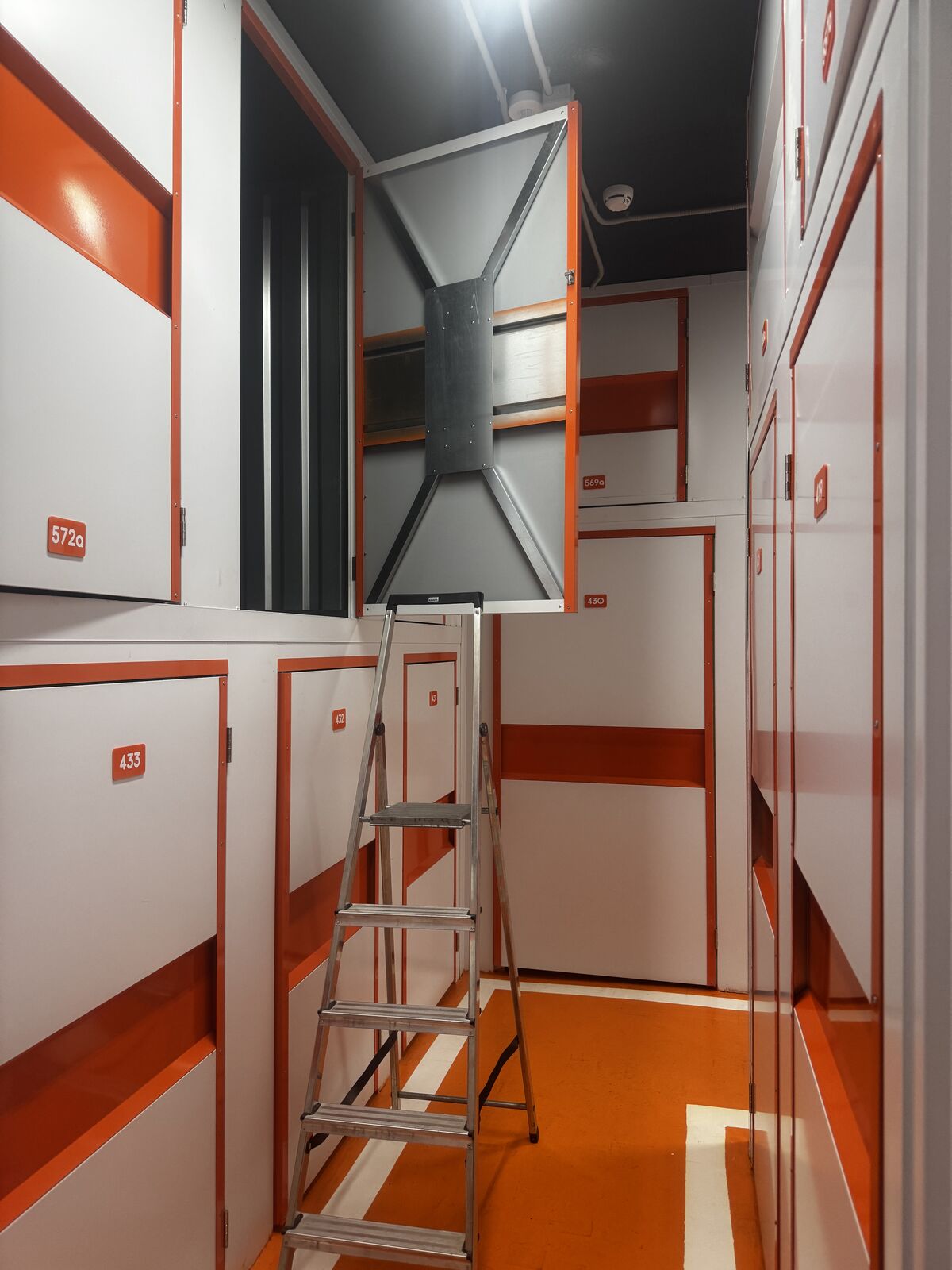 Кладовки 2-го яруса высоко: чтобы попасть в них, используйте лестницу-платформу. Такие антресольные боксы бюджетнее, но в них сложнее размещать тяжелые предметы.